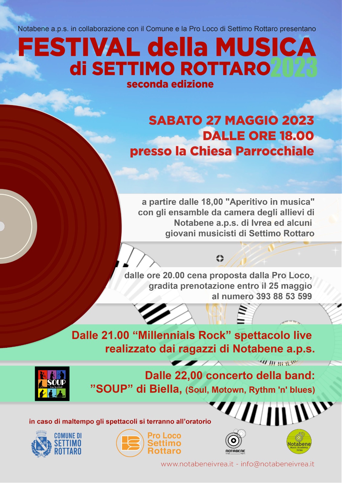 L'ASSOCIAZIONE NOTABENE IVREA A.P.S. in collaborazione con il Comune e la Pro Loco Settimo Rottaro organizza la 2^ Edizione del Festival della Musica. Tutti i dettagli dell'evento qui ↓