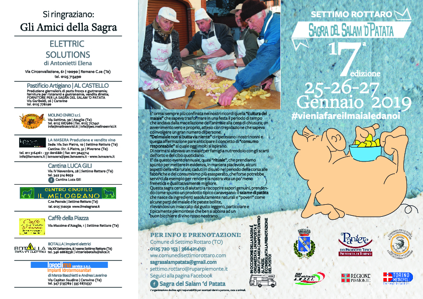 Questa sagra cerca di aiutare a riscoprire sapori genuini prendendo come spunto un prodotto tipico canavesano: il salame di patata che nasce da ingredienti assolutamente naturali “poveri” come alcune parti del maiale e le patate bollite rilevando un insaccato dal gusto leggero, particolare e tipicamente piemontese che ben si abbina ad un buon bicchiere di vino rosso nostrano.