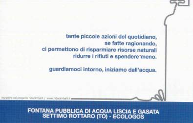 Ma perché una fontana pubblica di acqua frizzante? I motivi sono molteplici. Intanto è inutile negarselo oggi la stragrande maggioranza delle persone beve acqua frizzante per cui se questo è il motivo principale per cui l’Italia è uno dei paesi con il maggior consumo pro-capite del mondo di acqua in bottiglia abbiamo pensato di gasarcela quest’acqua, dopodiché chi si reca alla fontanella potrà tranquillamente riempire le proprie bottiglie anche di acqua “liscia”. L’unica aggiunta che verrà fatta è quella di anidride carbonica senza altri strani composti come gli acidificanti utilizzati per mantenere a lungo la gasatura nelle bottiglie in commercio. L’acqua degli acquedotti è molto più controllata, per lo meno pubblicamente, di quella dei produttori privati (basta guardare sull’etichetta la data dell’ultima analisi effettuata) e spesso è anche di miglior composizione chimico-fisica ed inoltre ha un costo infinitesimamente più basso. E’ palese e certamente non secondaria l’eliminazione dei contenitori in plastica. Basta procurarsi qualche bottiglia con tappo avvitabile che si potrà riempire infinite volte e il gioco è fatto. In base ai consumi terremo monitorata la quantità di plastica non utilizzata, il minor consumo energetico per produrla e di conseguenza il minor inquinamento immesso in atmosfera. Altro aspetto da non trascurare è quello dei trasporti. Ogni cittadino potrà tranquillamente recarsi alla fontanella a piedi o in bicicletta evitando in tal modo di recarsi al supermercato per acquistare confezioni di acqua che spesso e volentieri giacciono per mesi in piazzali assolati.